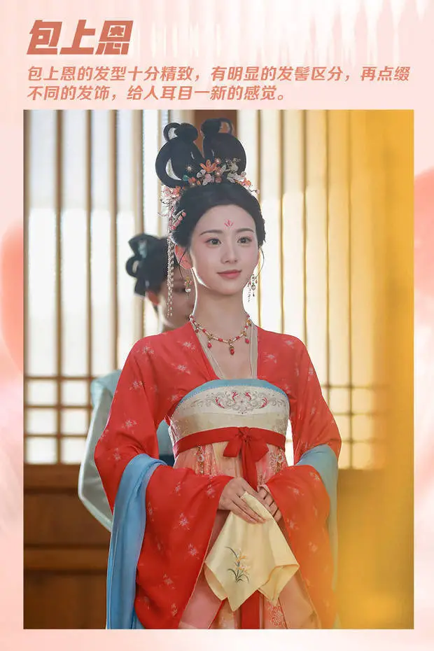 包上恩的发髻有很多巧妙的改变,符合唐朝女性有100多种头型的历史事实,同时造型师也给她准备不同的发饰,让照片里的她明艳动人。