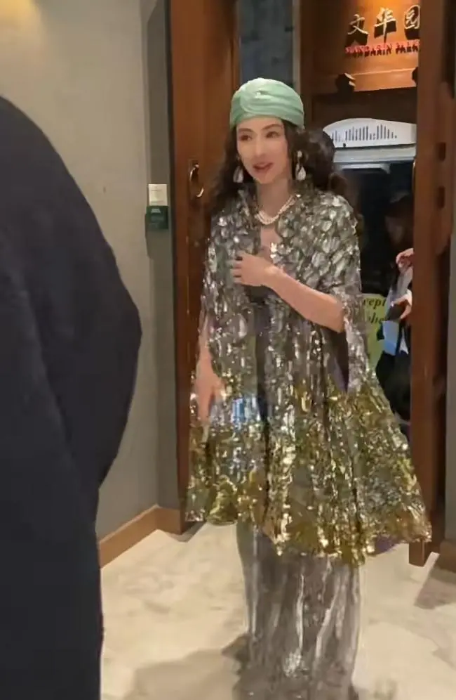再看张柏芝的第二套造型,同样包裹着头巾,但颜色没有之前那么花哨,变成了绿色系。张柏芝上身披着绿色头巾,身上披着波光粼粼的外套,仿佛一条游出水面的美人鱼。这套造型和第一套一样,也看不出张柏芝的真实身材。不过从后背还是可以感受到,张柏芝的背膀宽厚了不少。