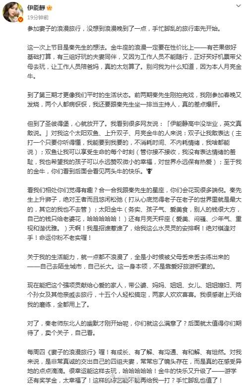4月24日晚间,伊能静在社交平台发了一篇长文,分享了自己参加《妻子的浪漫旅行》的幕后故事。本以为是她自己想上节目秀恩爱,结果人家直接爆料:这一次上节目,其实是秦先生的想法。 消息一出,网友直呼:这波操作,很秦昊。